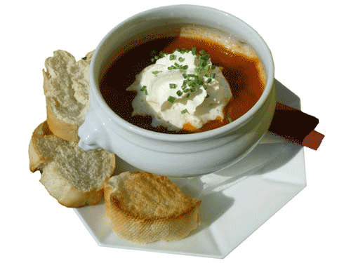 Französische Zwiebelsuppe mit überbackenen Baguettescheiben |